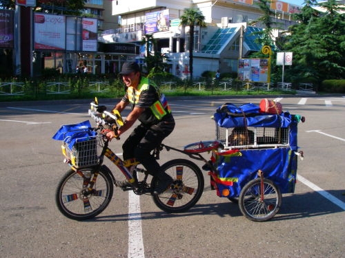 Сегодня утром увидел примечательного человека на велосипеде с прицепом, в прицепе была клетка с овчаркой, на вело надпись Якутия — Армения.
