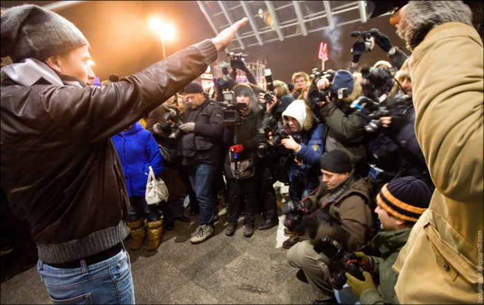Собственно провел провокатора и его друзей на место действия сам начальник Управления информации и общественных связей ГУВД Виктор Бирюков, это видно на видео, далее удалился, нашисты начали позировать, ими руководили по мобильной связи.