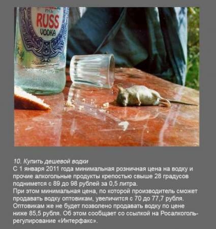 4. Не будет дешевой водки (С 1 января 2011 года минимальная розничная цена на водку и прочие алкогольные продукты крепостью свыше 28 градусов поднимется с 89 до 98 рублей за 0,5 литра.
