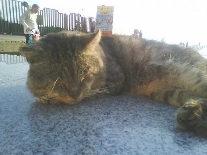 вот фото 2006го года… на набережной, там лавочки раньше стояли в длинный ряд и бабульки постоянно загорали… наверху как раз беседка и вход в парк им. Фрунзе… может и тот самый кот… а может и нет) помню Этот (на фото) там постоянно был, а когда лавочки убрали — переместился в сторону Жемчужины…