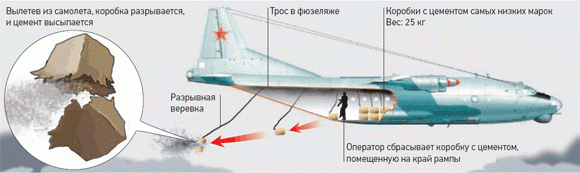 А теперь давай логически — неимоверное количество цемента рассыпают по мешочкам(это уже из твоей ссылки), затем, на огромной высоте и скорости что? стоят узбеки перед открытым люком и потрошат мешочки, иногда их роняя…