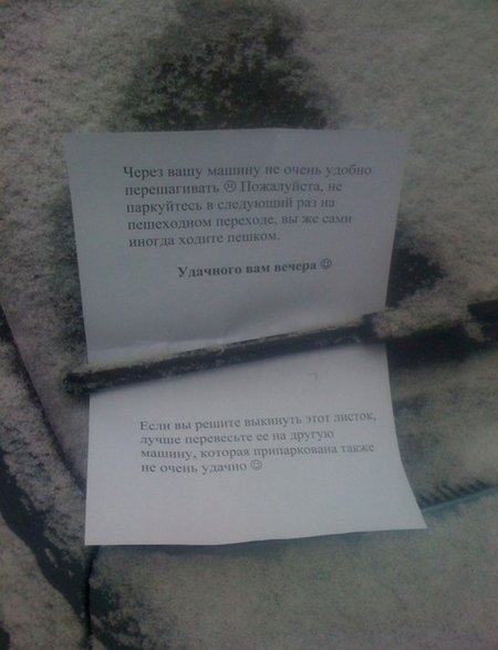 2. Если, паркуясь, видите, что ваша машина может помешать кому-либо (например, вы блокируете выезд другого а/м с места его стоянки) — оставьте под лобовым стеклом изнутри листок бумаги с написанным на нем номером вашего мобильного телефона.