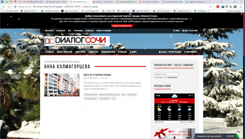 Лишившись редактора и единомышленника, но испытывая родственные чувства к изданию «Диалог Сочи», я продолжила работать. С фатальной уверенностью, что Бугайчуку все-таки важно развивать портал и видеть актуальные и честные публикации. Необходимо отметить, что электронный вариант «Диалог Сочи» предполагал возможность публиковать свои материалы зарегистрированным пользователям.