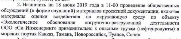ООО «Си Инженеринг» информирует о начале с 20.12.18 по 20.03.19г процессов оценки воздействия погрузочно-разгрузочной деятельности ООО «Си Инженеринг» применительно к опасным грузам (нефтепродукты) в морских портах Кавказ, Тамань, Новороссийск, Туапсе, Сочи. Замечания принимаются по адресу АО«ЮжНИИМФ»: institute@ujniimf.ru ТЗ по оценке воздействия на окружающую среду доступно с 18.12.18 года на официальном сайте по адресу: https://ujniimf.ru на доске объявлений.