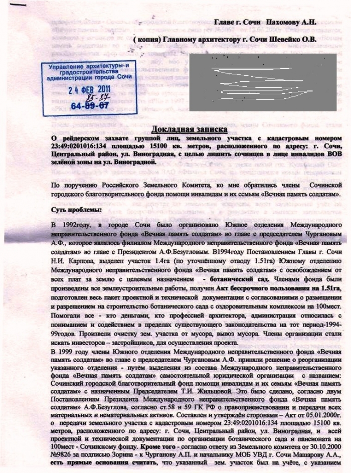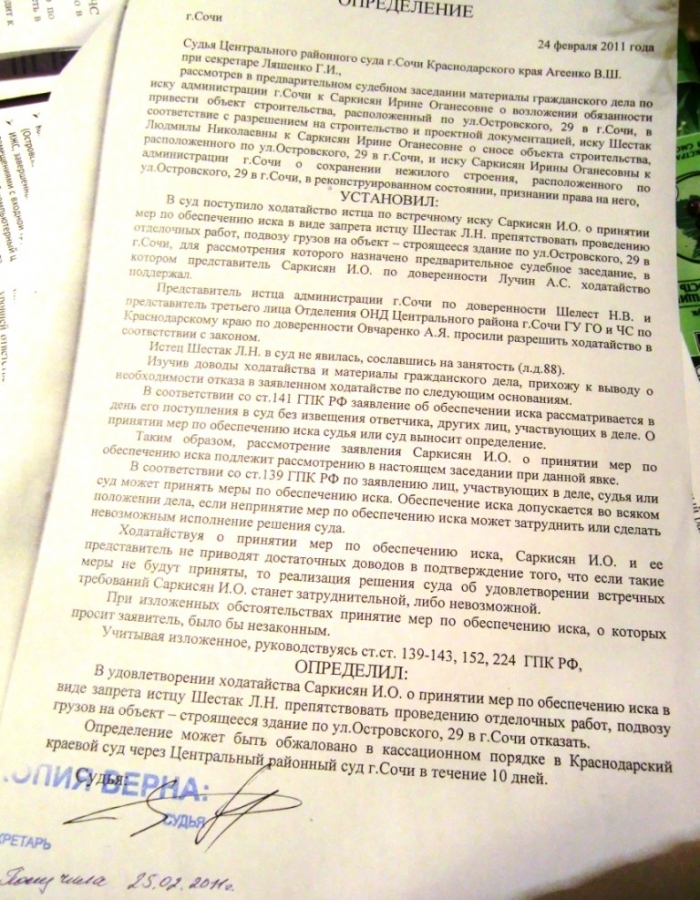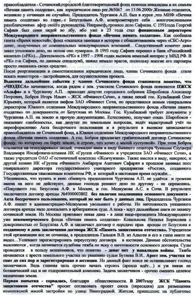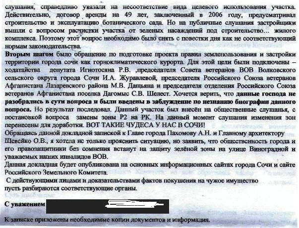 «Так 28.01.2009 года было совершено покушение на члена Градостроительного совета Шестак Людмилу Николаевну. Как следует из ответов прокуратуры г. Сочи, расследование уголовного дела, возбужденного по факту нападения Шестак Л.Н., проводилось с многочисленными нарушениями Федерального законодательства, за что неоднократно накладывались дисциплинарные взыскания на следователей, проводивших расследование. Виновный в покушении на убийство Шестак Л.Н. до настоящего времени не установлен. Этому также способствовало бездействие властей, не нашедших виновных в ранее имевшем место обстреле и попытке поджога её квартиры».