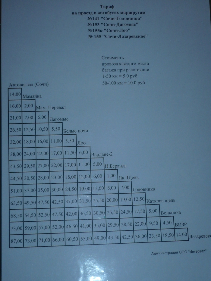 Если с вас берут больше установленного тарифа сразу же звоните на горячую линию автоуправления, больше никакими мерами зарвавшихся маршрутчиков в чувство привести невозможно. Кроме того, на всякий случай сообщаю тарифы, оказывается, от поста ГИБДД до Дагомыса проезд на маршрутке составляет 7 рублей, соответственно до перевала 2 рубля и от перевала до Дагомыса — 5 рублей… С автовокзала до перевала стоимость проезда 18-50руб (очень умиляют 50 коп)...