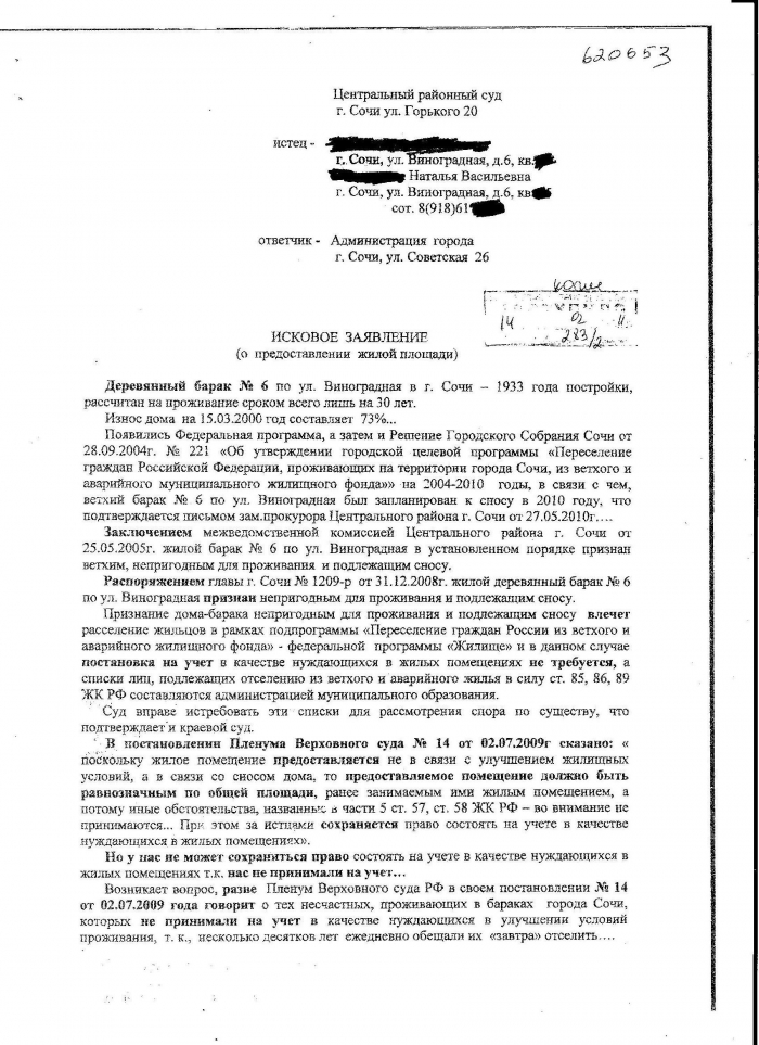 В крации расскажу, в чем дело. Есть жилой дом по ул. Виноградной рядом с федеральной трассой, но домом его назвать нельзя. Это деревянный концлагерь 1933 года постройки и рассчитан на 30 лет эксплуатации. Построен из дранки. Горячей воды, ванны и душа в доме небыли никогда.Квартиры в доме от 7 до 19кв.м. Потолок во многих комнатах держаться на подпорках. Стены выпадают. В 2005г. дом обследовала межведомственная комиссия и признала его аварийным и опасным для дальнейшего проживания в нем граждан. Но и после этого глава города признавать его аварийным не торопился. Дом официально признан аварийным на основании распоряжения главы города Сочи от 31.12.208г. За №1209-р. Жильцы многократно обращались в управление ЖКХ администрации города и получали отписки якобы будет строиться дом на ул.Чехова и к марту месяцу 2011 вас расселят, а воз и ныне там. Федеральным центром были выделены бюджетные средства на строительство дома.