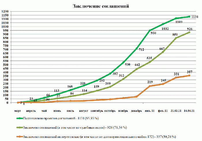 Всего для размещения олимпийских объектов федерального и краевого значения у граждан и юридических лиц подлежит изъятию 1416 объектов недвижимого имущества. На 21 апреля 2011 года были подготовлены и вручены правообладателям проекты соглашений об изъятии недвижимого имущества в отношении 1170 объектов недвижимости. Из них в отношении 953 объектов недвижимости соглашения подписаны. 816 правообладателей получили взамен денежную компенсацию в отношении 625 изымаемых объектов недвижимости, 155 правообладателей получили взамен индивидуальные жилые дома. Сумма выплат с учетом 2009 года составила уже более 8,2 миллиардов рублей. Кроме того, заключено соглашений на предоставление 30 квартир на праве собственности и подписано 172 договоров социального найма.