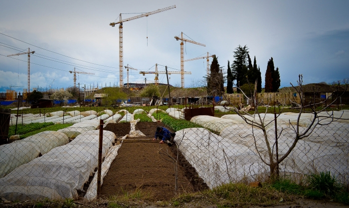 Территория олимпийского строительства хорошо охраняется. Внутрь попасть просто так нельзя. Белые арочные металлические конструкции- будущая ледовая арена для керлинга.