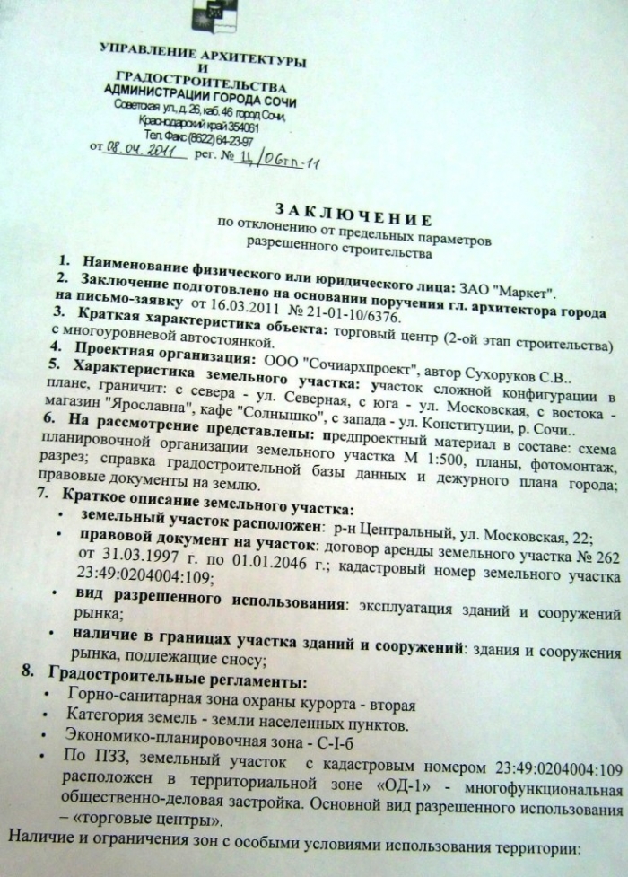— предоставление ЗАО «Маркет» разрешения на отклонение от предельных параметров разрешенного строительства по ул. Московская, 22 в Центральном районе г. Сочи.