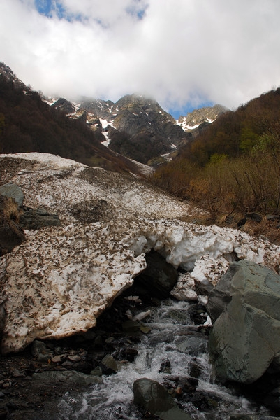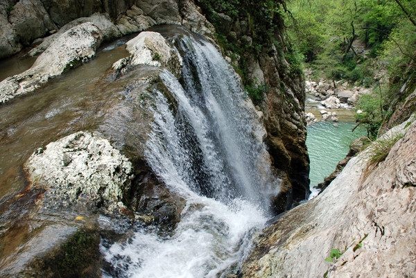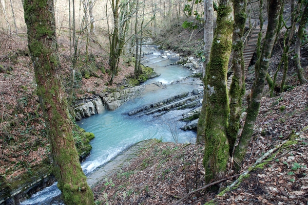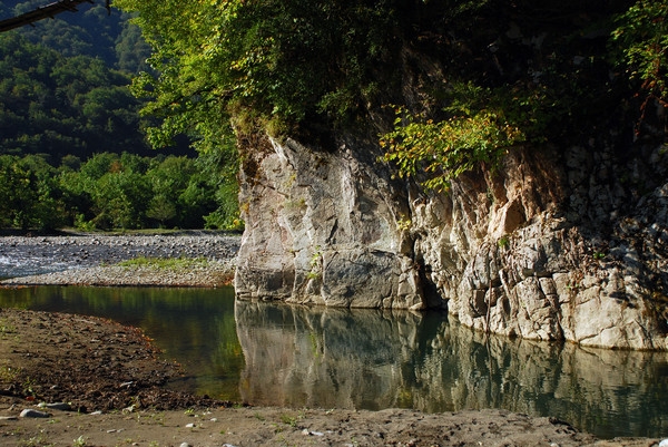 Недавно сам узнал. Оказывается — это выдоблена тропинка к висячему мосту, который был перекинут на левый берег Мзымты, где был лагерь для строителей. То есть они на работу и с работы пробирались по этому мосту…