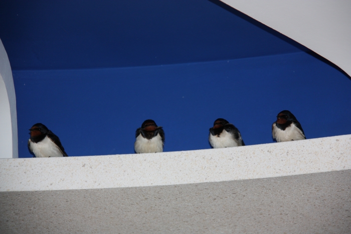 Пытался найти у себя фото из Абхазии, там в доме ласточки гнездо сделали на втором этаже в коридоре, когда птенцы вырастают — в гнезде уже не помещается, так они ночуют на рожках люстры — ходим от них в паре метров…