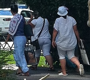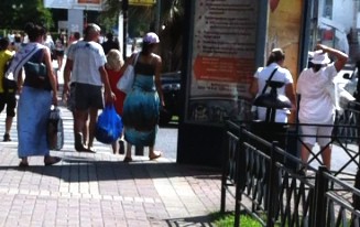 Одна идет в примерочную, две другие ходят по магазину и промышляют. Одна из них: лет 19 — 22, одета во все белое, широкое лицо с желтоватым оттенком от загара. Внимание привлекают белые просвечивающиеся лосины, похожа на цыганку. Вторая: тоже похожа на цыганку, лет 33-36, одета во все белое, в том числе в белые лосины, на ногах белые шлепки, больше похожи на мужские (такие еще в бассейнах выдают), на голове белая панамка с надписью «Russia». Стараются одеждой не выделяться из толпы отдыхающих.