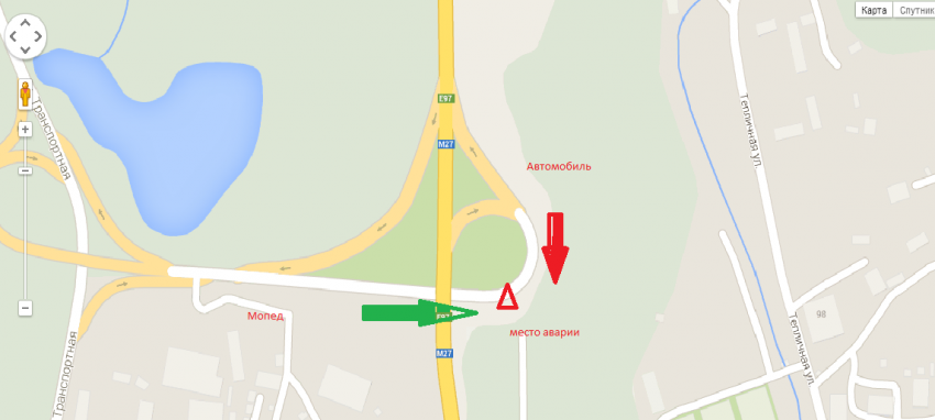 Я так понимаю, ехал дедушка на мопеде, а автомобиль ехал во встречном направлении. Что то с автомобилем случилось, он врезался сначала в отбойник, потом выехал на встречную полосу и в лоб врезался в мопед с дедушкой.