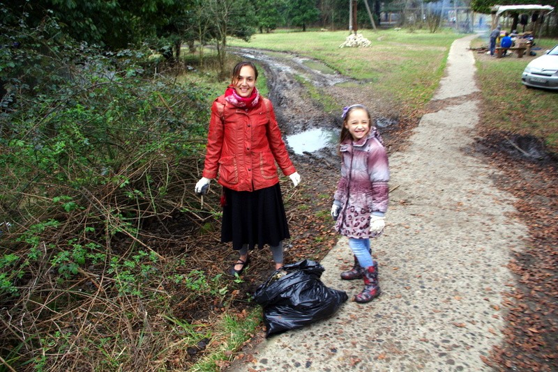 Собравшимся людям были выданы перчатки и мусорные пакеты, и они живо разбрелись по поляне и начали собирать мусор. Несмотря на хмурую погоду, настроение было у всех замечательным, особую радость добавляла залихватская музыка, которая не давала заскучать.
