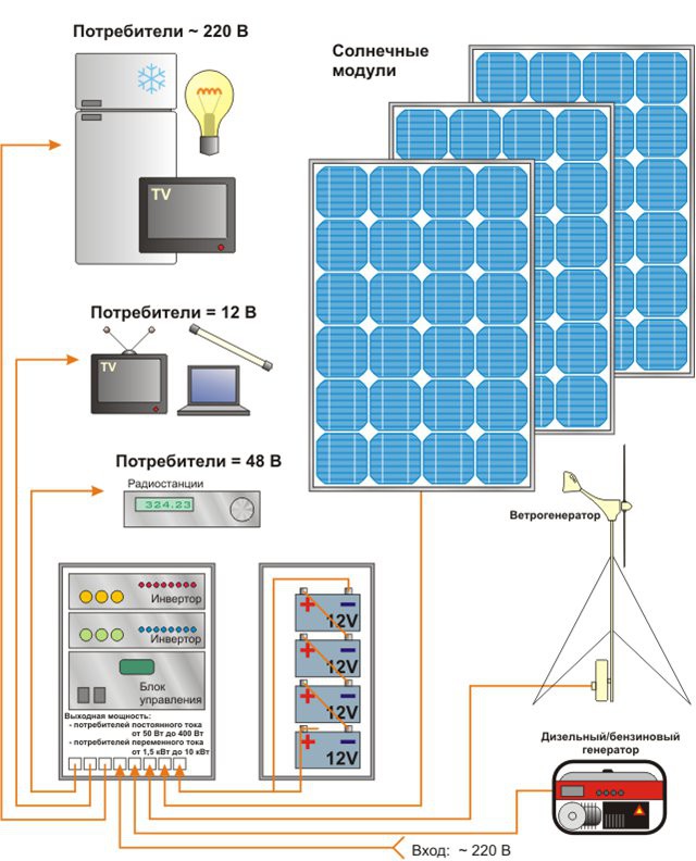 А по солнечным нужно искать на медной аснове панели, кремнивые очень мало слуужат и не окупают себя, а на медной основе до 50 лет, и работают даже ночью и в пасмурную погоду. Остальная система и акб практически одинаковы