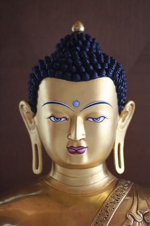 Основатель буддизма Сиддхартха Гаутама происходил из царского рода Шакья и юные годы провел во дворце, купаясь в роскоши. Мочки его ушей оттянулись под тяжестью серег, которые он носил. От огромного богатства он отказался, чтобы встать на путь духовного просветления. В буддийской иконографии образ Будды Гаутамы детально регламентирован. Так, в тибето-монгольском словаре буддийских терминов «Источник мудрецов» приводится 32 основных и 80 второстепенных признаков, отличающих его от прочих людей. В частности, на голове Просветленного находится ушниша (овальный выступ) — чакра соединения с космосом. Между пальцами его рук — перепонки, говорящие о том, что он способен существовать в воде (в буддизме вода — один из символов иных миров). На канонических изображениях Будда обычно предстает сидящим в позе лотоса на символических дисках солнца и луны как повелитель мира. Поза лотоса означает углубленное созерцание. Правая рука Будды касается земли, символизируя просветление, достигнутое вопреки козням злого демона Мары: когда Шакьямуни обрел освобождение, он призвал в свидетели мать-землю.