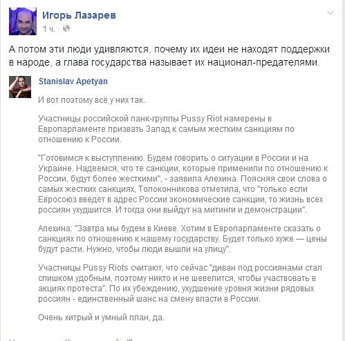 Наша неполживая интеллигенция и «пятая колонна» решила защитить певца киевской хунты. Михаил Прохоров, Людмила Алексеева, Лев Пономарев, Лия Ахиджакова, Дмитрий Быков и остальной союз творческой «элиты» и национал-предателей, видимо, тоже считают, что народ уже не спасти… а Макаревича еще можно!