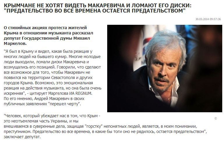 Ведь Макаревич-то не виноват ни в чем. Ну подумаешь, говорил, что надо оставить Крым на растерзание бандеровцам, что не надо защищать там население. Ведь по его мнению Путин специально пугает неонацистами, чтобы «оттяпать» Крым.