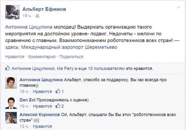 Председателем оргкомитета Дней робототехники в Сочи стала Антонина Цицулина – Президент некоммерческой организации «Ассоциация предприятий индустрии детских товаров», Член Координационного совета при Президенте РФ по реализации Национальной стратегии действий в интересах детей, человек безусловно опытный в реализации самых разных проектов. На этапе подготовки А.Цицулина вела специальную группу в фейсбуке, где каждый мог высказаться, предложить что-то и получить ответы на самые разные вопросы. Простому обывателю казалось, что процесс открытый и идет по плану.