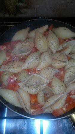на сковороду кусочек масла, макароны, резаные помидорки (если вы любите томат, то положите не 2 помидора, а все 4! будет вкуснее и сочнее), перец, базилик и потушить под крышкой