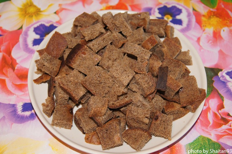 Беру кастрюлю, в которую помещается пять с небольшим литров воды. Для кваса необходимы ржаной хлеб, намного сахара и дрожжей. Хлеб обычно использую нашенского хлебокомбината, тот который «К чаю», ибо в нем присутствует ржаная мука и изюм, нарезанный вот таким вот образом