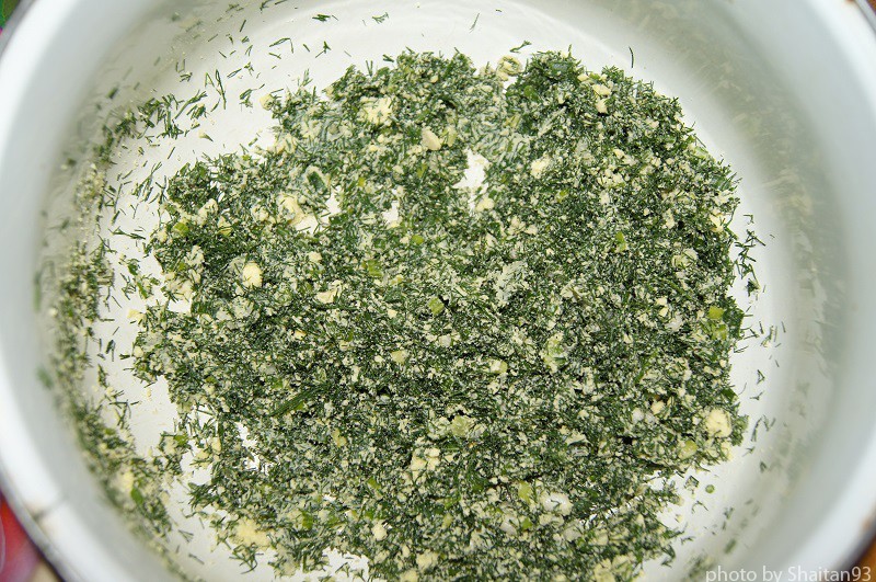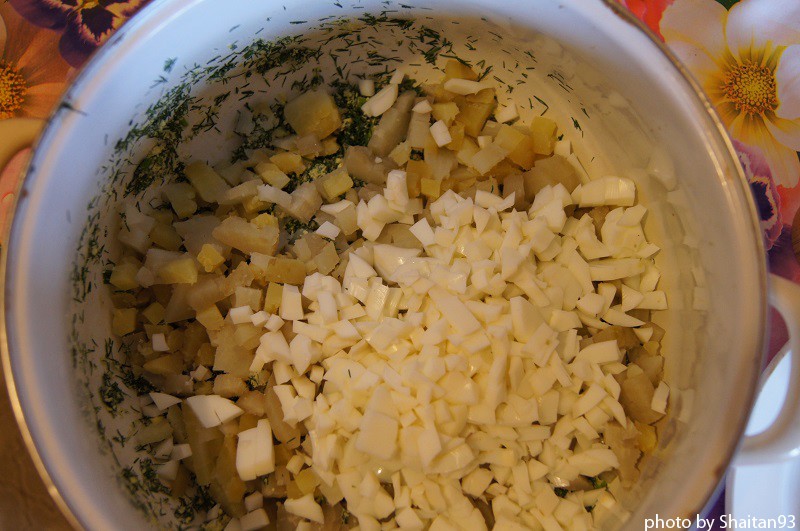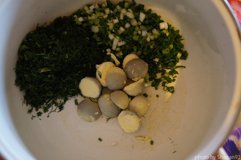 максимально мелко режу весь укроп и половину лука; все это перетираю (обычно ложкой) с яичными желтками и солью, и оставляю в открытой кастрюле, дабы все домашние вдыхали ароматы и истекали слюной в предвкушении ням-няма :-)