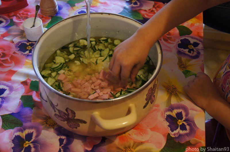 При этом надо следить за домашними (в особенности за малыми), что бы избежать с их стороны попыток ухватить из кастрюли кусок до того, как окрошка будет готова
