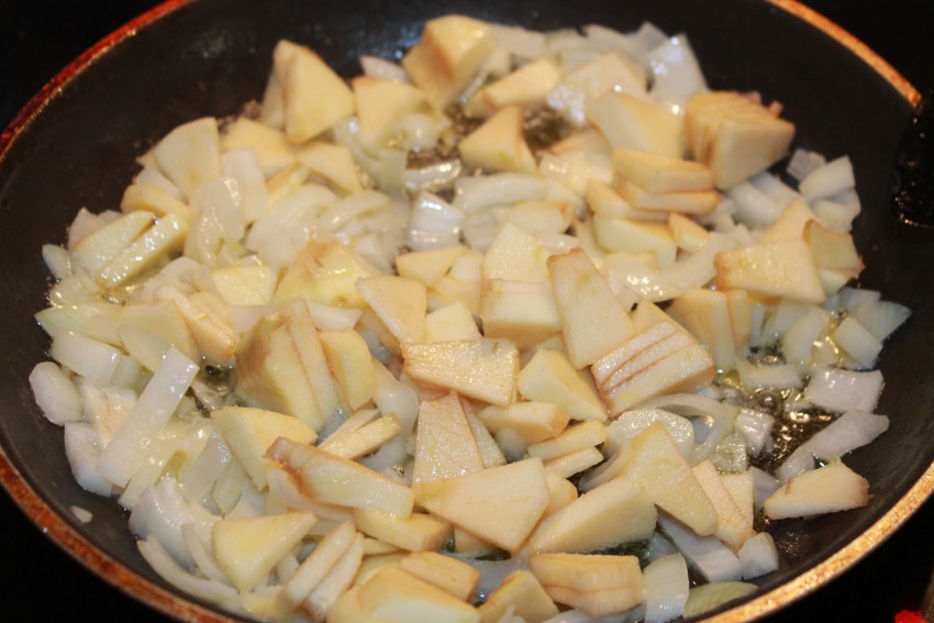 нарезаем лук яблоко жарим 4мин на сливочном масле