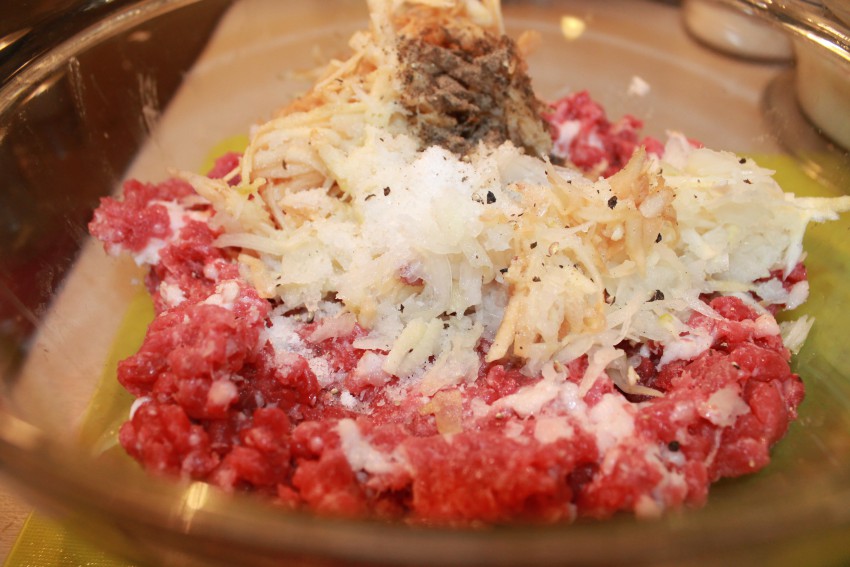2.Натрем на терке лук, яблоко солим, перчим вымешиваем с фаршем(600 гр говядина) добавляем хлебно-яичнную массу.