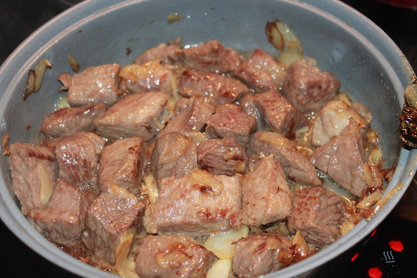 лук немного поджарим и на него кладем мясо первое время не мешаем