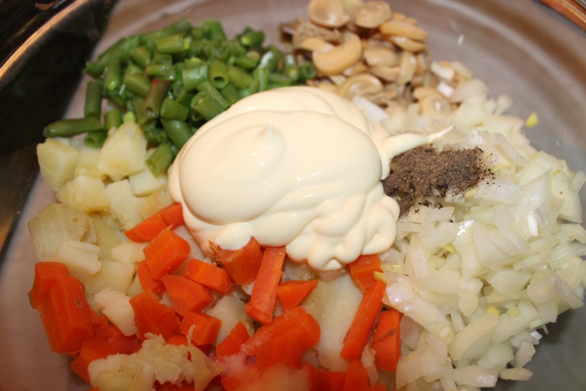 Пару картошек, одна морковка, луковица, консервированные шампиньоны, фасоль (ее пару минут отварить и мелко нарезать), соль, перец, постный майонез.