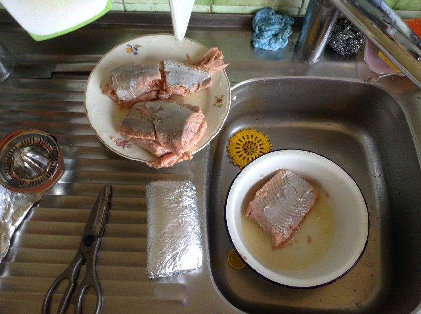 Проснувшись на следующий день сразу представил себе пяти- семи часовую тряску на своей заднице по дорогам к месту пьянки, вернее рыбалки. Полчища прожорливых комаров, обратную дорогу в похмельном состоянии. Понятно описано почти научное обоснование отказа от очередной идеи?.. :) Ну а теперь перейдем к непосредственно кулинарной теме.:) Собирались выехать на природу. Закупил рыбу, мясо. Привез домой. Женщины готовы умереть от голода, отказываясь чистить рыбу :) Потому, идя на поводу собственного желания пожрать до отвала этой вкуснятины, взял эту обязанность на себя. Как собственно и разделку мяса. Прогноз погоды: ожидаются осадки, штормовое предупреждение. Что делать? Рыба разных видов для гриля, вертела. Толстая, жирная… Говядина охлажденная почти два кило. Свиные ребра. Жалко в морозилку. И тут я вспоминаю о забытой уже, не использованной сушилке. Самое смешное, что физически почти ни чего делать не надо. Блюда для полных лентяев, но ДЕЛИКАТЕСЫ! Признанные деликатесы! Режу на три части говядину и засыпая крупной солью ставлю в холодильник.( не в морозильник) Все! На неделю! Только раз в сутки рекомендуется переворачивать куски. литр воды. Половину в плоскую миску и в морозилку. Вторую половинку на газ, засыпая три столовых ложки соли, ложку сахара, приправы для рыбы ( Можно собирать самому из разных семян, но я лентяй), укроп для засолки. Потрошу жирную скумбрию, снимаю пласты мякоти с почти 4-х килограммовой кеты. Пласты солю, складываю по два, оставляю на время в покое. В посудину сливаю через сито кипящий рассол, вливаю туда воду и лед из морозилки. Вода до 50 градусов с невероятно приятным запахом, бросаю туда скумбрию, ставлю в холодильник. Скумбрия будет готова через пару дней и может храниться как селедка в рассоле- вечно!))))) На все процедуры в этот день ушло минут 40. Задержка была с охлаждением воды. Через пару часиков Кету смачиваю рассолом, обильно сбрызгиваю лимонным соком и заворачивая в фольгу, оставляю в холодильнике до утра с последующей переправкой в морозильник. И вот почти весь цикл: Мясо на второй день, соль уже растворилась в соке мяса: