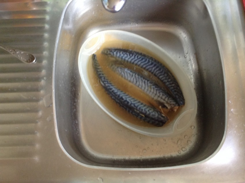 Ну а через недельку сливаем все, моем мясо и заливаем холодным рассолом со специями для мяса на пару дней. Затем на ночь ставим на мясо в раковине самую большую кастрюлю, ведро с водой выдавливая с него все соки. Утром обваливаем в специях и вывешиваем. Каждый делает по своему. Я для себя делаю именно так. Цикл для мяса — 18- 20 дней. Для рыбы с кожей не менее 2-х дней. Семга- можно и два часа, но лучше сутки продержаться и уж потом… Это уже готовая скумбрия. Из этой посудины одну уже съели. Это дефффффицит! А запах!, как восклицал Райкин :) Без костей в отличии от селедки, без консервантов и прочих добавок в магазинных малосольных рыбных продуктах.