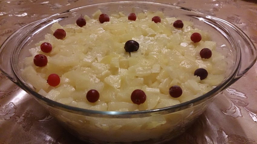 Грибы обжариваем на сковороде с добавлением оливкового масла, затем измельчаем все упомянутые ингредиенты, включая «резаные ананасы», как можно мельче. К вареному картофелю очень подойдет крупная терка, а к яйцам — яйцерезочка.