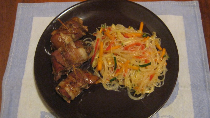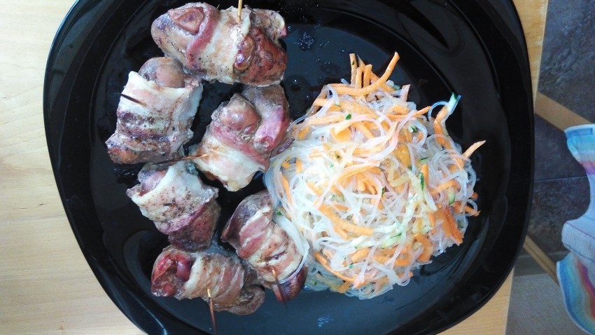 Рулетики из куриной печени с беконом и с салатом из фунчозы. :)