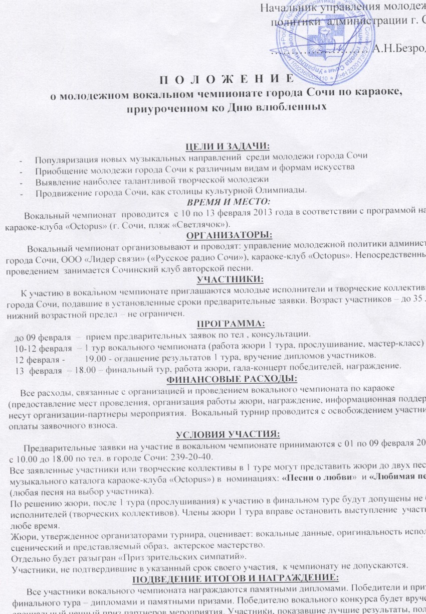 о молодежном вокальном чемпионате города Сочи по караоке,