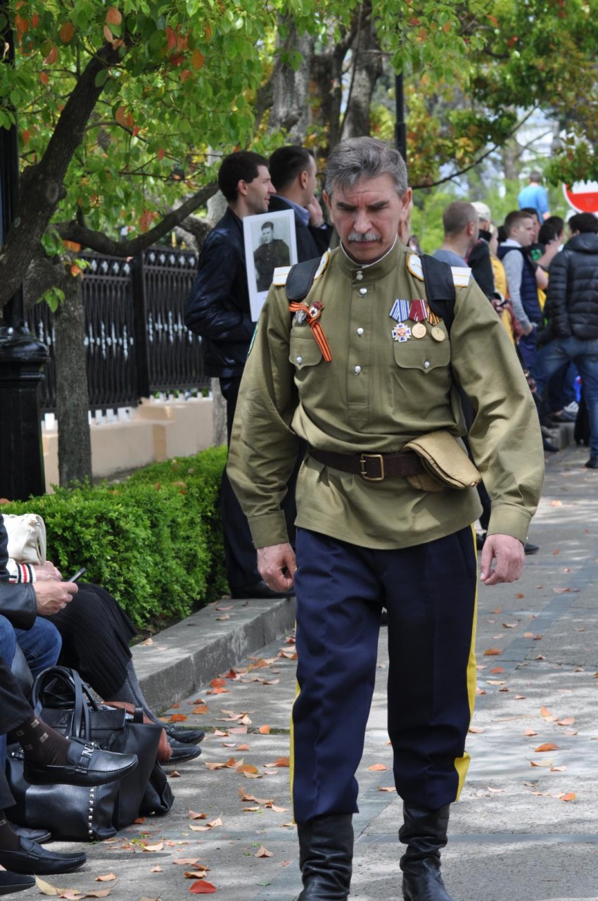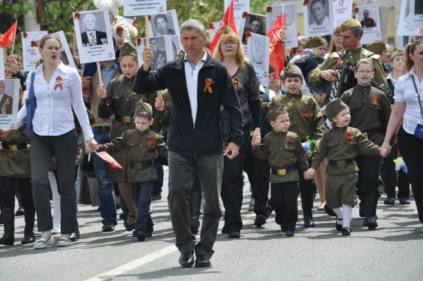 В России каждую весну проходит акция «Георгиевская ленточка». Каждый желающий может получить небольшую георгиевскую ленточку — символ памяти и уважения к подвигу русского народа, одержавшего великую победу над фашизмом. Ленточка начинает свою историю от ленты к солдатскому ордену «Святого Георгия победоносца» учреждённого 26 ноября 1769 года императрицей Екатериной второй. Эта лента с небольшим изменением вошла в наградную систему СССР, как гвардейская лента -знак особого отличия солдат. Ею обтянута колодка очень почётного солдатского Ордена Славы. В Георгиевской ленте чёрный цвет означает дым, желто-оранжевый — пламя.