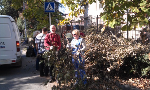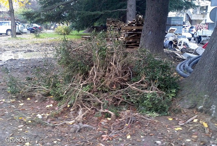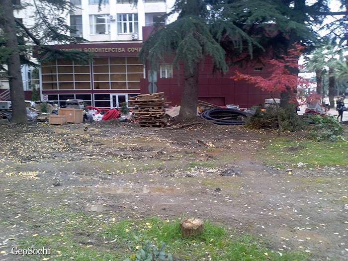 На фото видны даже оранжевые тужурки рабочих, ведущих какие-то свои работы «прямо у дверей центра волонтерства». Пеньки. И что с этими рабочими и пеньками делать добровольцам-волонтерам? И почему они должны вмешиваться в ведущиеся работы, в том числе по уборке мусора за ведущими эти работы?
