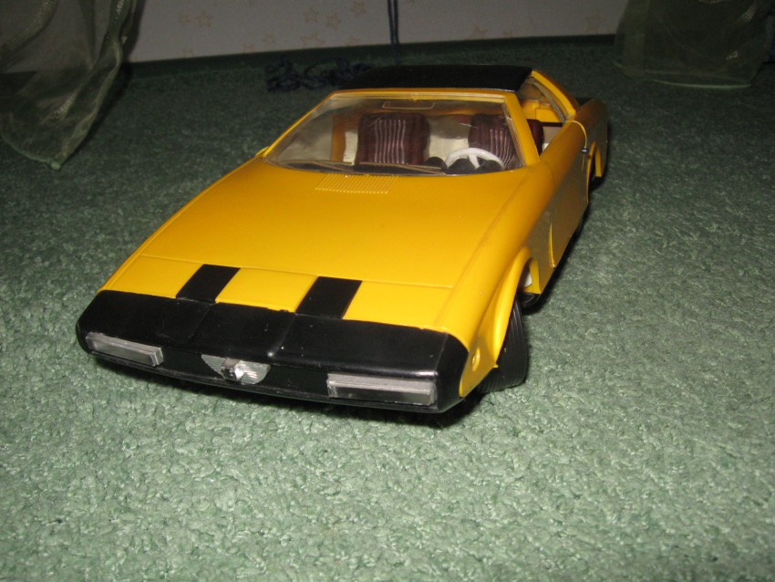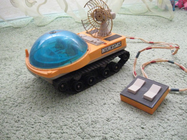 вот есть еще такой экземплярчик, тех же годов, но не уверен что нашего производства, ни коробки ни управления не сохранилось((( но игрушка крутая, вперед-назад колеса поворачиваются, фары, сигнал! в багажнике стол и два стула, за рулем был человечек)