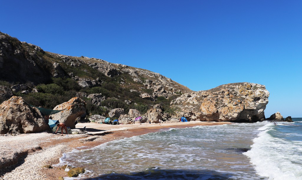 Ну, а мы переезжаем к Золотому, с некоторым трудом находим место для палаток и машины — народа много. Но, все равно не так как на берегу Чёрного моря. Здесь и ветер поменьше, и волнения моря практически нет.