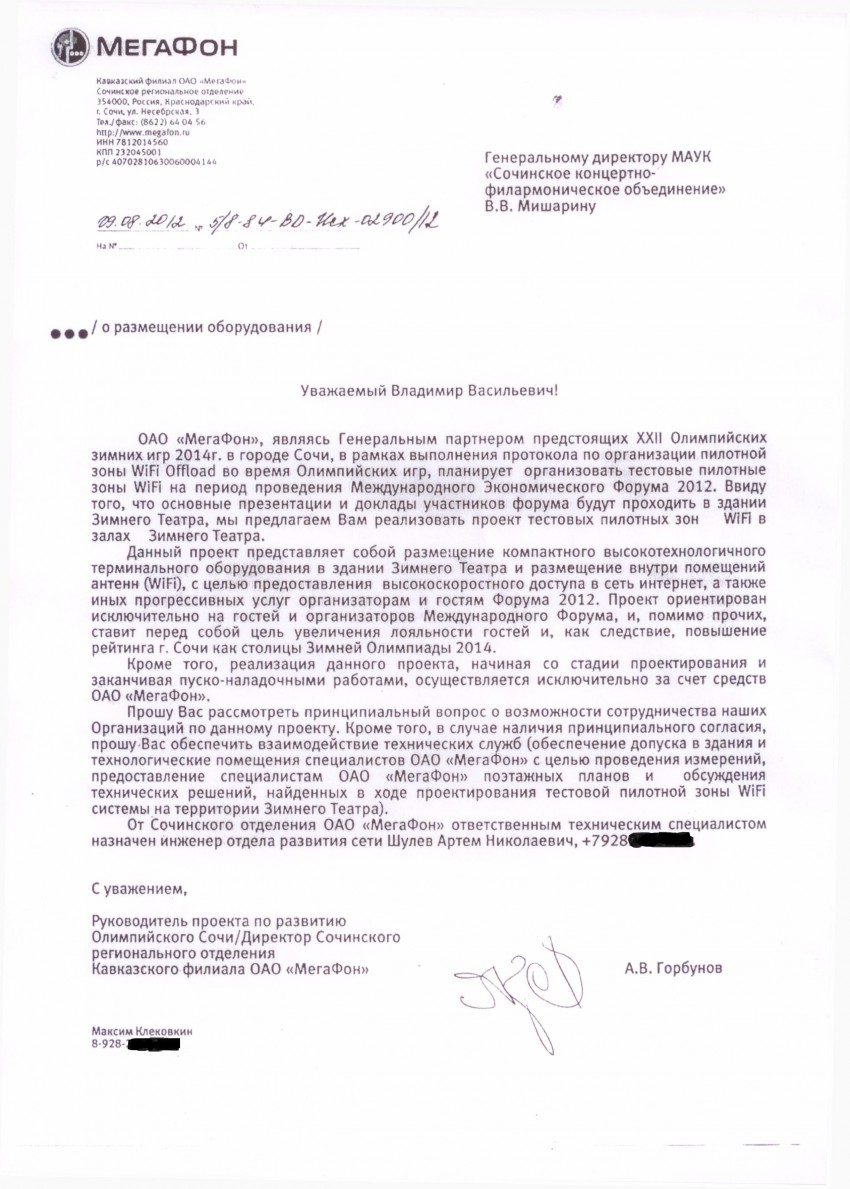 Ниже приводится сканкопия письменного обращения ОАО «Мегафон» за подписью Директора Сочинского регионального отделения Кавказского филиала А. Горбунова от 09 августа 2012 г.