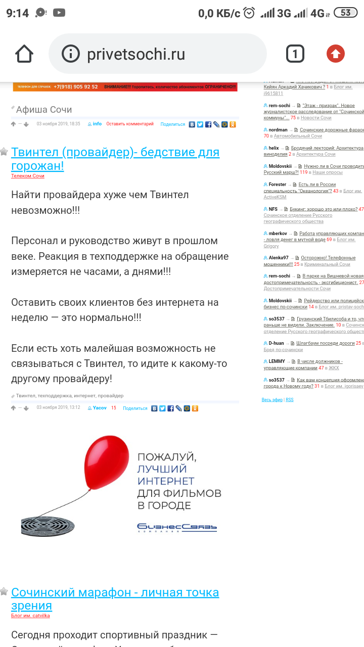 RSS свернуть / развернутьЕще два года назад Framer писал, что в Хосте полным ходом идёт прокладка кабеля Бизнес связь и у жителей домов по ул. Шоссейной 7а и 7б (Звёздочка) будет возможность сменить провайдера, но воз и ныне там. Раз в пол года звоню Дмитрию Печерских, который обещает подключить наши дома, так-же оставляю заявку на сайте, но видно, что провайдер не заинтересован в более 300 новых абонентах.