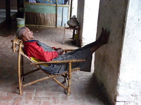 В отель шли жилыми улицами. Как описать?! Дома старые, 5-6 этажные. Окна, на которых вместо рам — решётки. Люди там спят, кушают, занимаются хозяйством и смотрят телевизор, который установлен в центре улицы (один на весь квартал). Всё это происходит на виду у соседей и прохожих. Здесь же ходят красивые петухи, бегают собаки, спят кошки и играют дети.