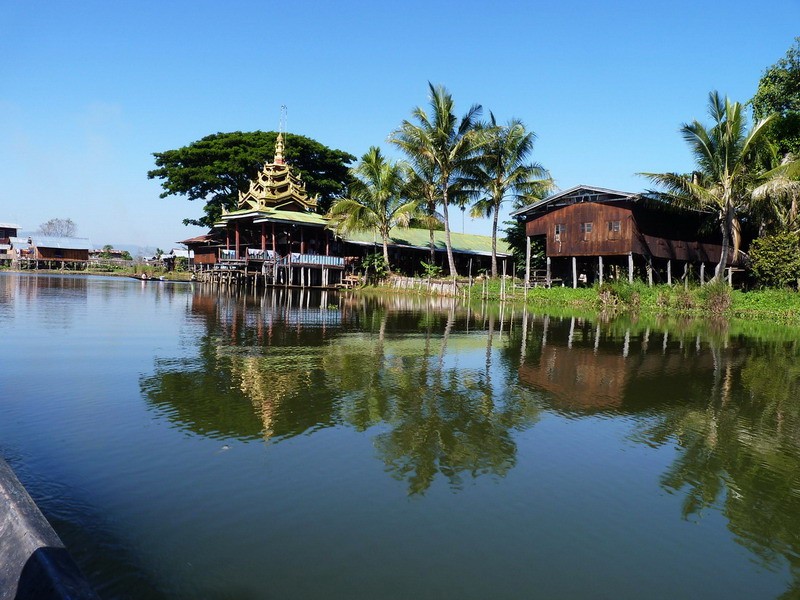, чтобы побывать на озере Инле. На въезде в город с нас содрали по 5 $. Что-то типа национального парка. Гостиницу нашли около красивого монастыря с несколькими золочёными пагодами. На всех пагодах звенят на ветру колокольчики. В темноте поужинали и прогулялись в сторону лодочной станции, где нашли лодочника и договорились с ним на завтра о путешествии на ½ дня с осмотром выбранных нами достопримечательностей. Это стоило 9 000 чат со всех.