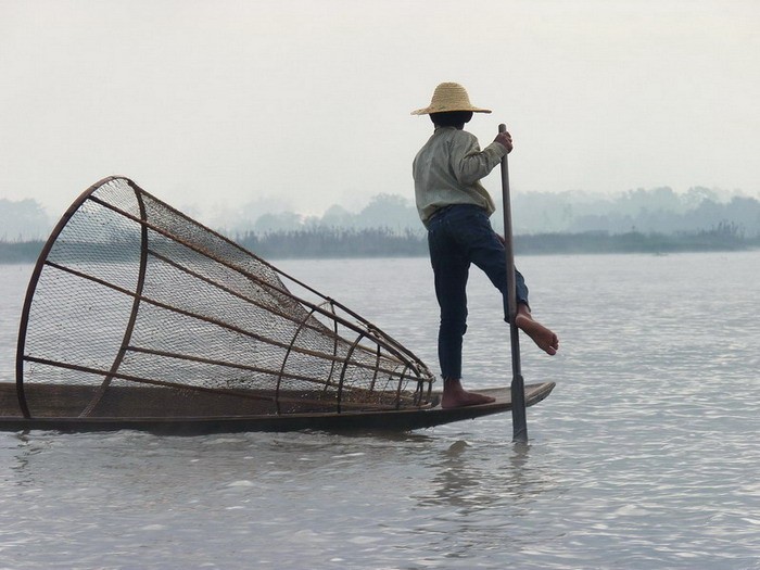 Холодным ветреным утром мы быстро плывём по протоке в моторной лодочке, управляемой капитаном в чёрной кожанке, постоянно жующим бетель и с неизменной улыбкой Будды на устах. Туман постепенно расходится, теплеет и через 15 мин. мы очутились на оз. Инле. Проплывают мимо баркасы, скоростные лодки, много чаек. Но самое интересное, что на лодках рыбаки стоят на одной ноге, другой гребут.