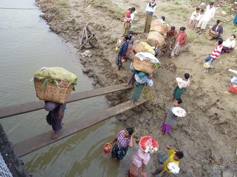 Несколько остановок в деревнях по пути. По двум деревянным доскам местные люди заходят и выходят с тюками, корзинами на головах.