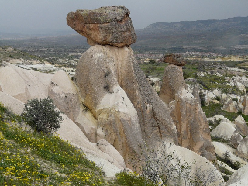 Следующий период характеризуется эрозией и выветриванием. Благодаря резко континентальному климату Каппадокии с внезапными и значительными перепадами температуры, в горных породах образовывались трещины. Вода и лёд способствовали разрушению скал, наряду с проливными дождями и воздействием рек. Именно таким образом были образованы знаменитые «каменные столбы» перибаджалары (тур. Peri bacaları, «камины фей», англ. fairy chimney) — останцы в виде каменных грибов и каменных столбов причудливых форм и очертаний. Геологический разрез этих образований выглядит следующим образом: наверху расположены базальты и андезиты, а внизу туфы.