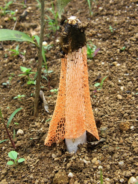 Высокая белая ножка, наверху маленькая чёрная шапочка, а с неё спускается почти до земли в виде колпака оранжевая сетка. Нарвали немного красного острого перца.