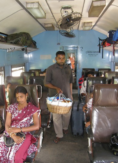 На потолке работает несколько вентиляторов, все окна без стёкол. Когда поезд едет, то вас обдувает лёгкий ветерок. Во время пути и на остановках разносят варённую кукурузу (початки у неё небольшие с оранжевыми зёрнами), пареный горох, креветки, запечённые в тесте, пончики из гороховой муки. Пить предлагают кокос (сок). Бродяг, калек, попрошаек я не видела.